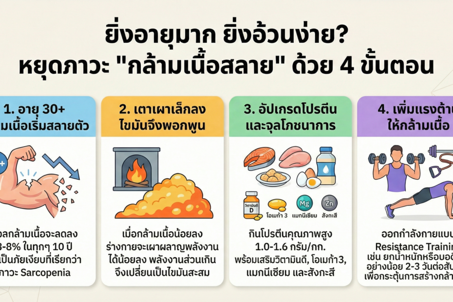 ปรากฏการณ์ “กินเท่าเดิม แต่น้ำหนักพุ่งกระฉูด” ไม่ใช่เรื่องลี้ลับเหนือธรรมชาติ และไม่ใช่แค่ข้ออ้างของคนวัยกลางคน คำถามยอดฮิตที่ผมมักจะได้ยินเสมอเมื่อผู้คนก้าวข้ามเส้นแบ่งของวัย 40 หรือ 50 คือ ทำไมร่างกายที่เคยควบคุมได้ ถึงเริ่มกบฏต่อเจ้าของ? กางเกงที่เคยใส่พอดีกลับคับตึง ทั้งๆ ที่พฤติกรรมการกินก็ไม่ได้เปลี่ยนไปจากเดิม ความจริงที่น่าตกใจก็คือ เรามักจะพุ่งเป้าไปที่ “ระบบเผาผลาญพัง” แต่กลับละเลยต้นตอที่แท้จริง ซึ่งเป็น “ภัยเงียบ” ที่กำลังคุกคามสรีระของเราทุกคน ภัยเงียบที่ว่านั้น วงการแพทย์เรียกมันว่า Sarcopenia… Read More »ทำไมยิ่งอายุเยอะยิ่งอ้วนได้ง่าย